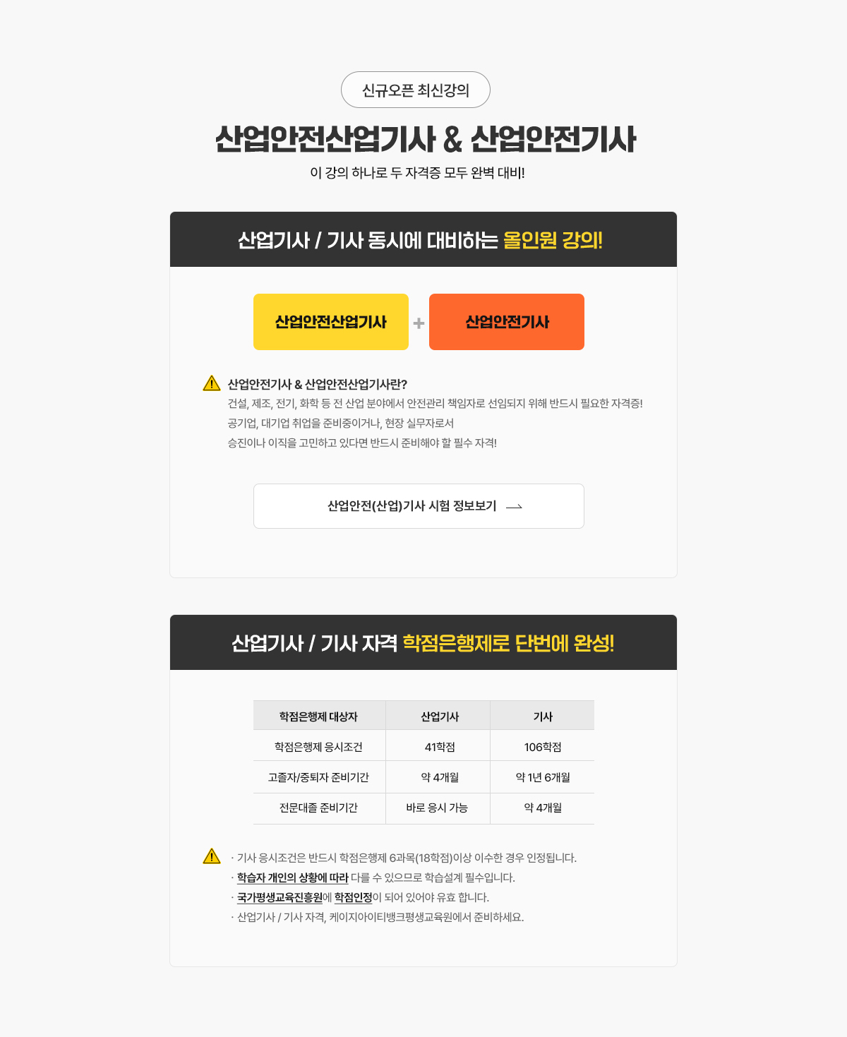 - 산업기사 관련학과 2년제 이상 졸업 / 관련실무 2년 이상 / 학점은행제 41학점 이수